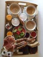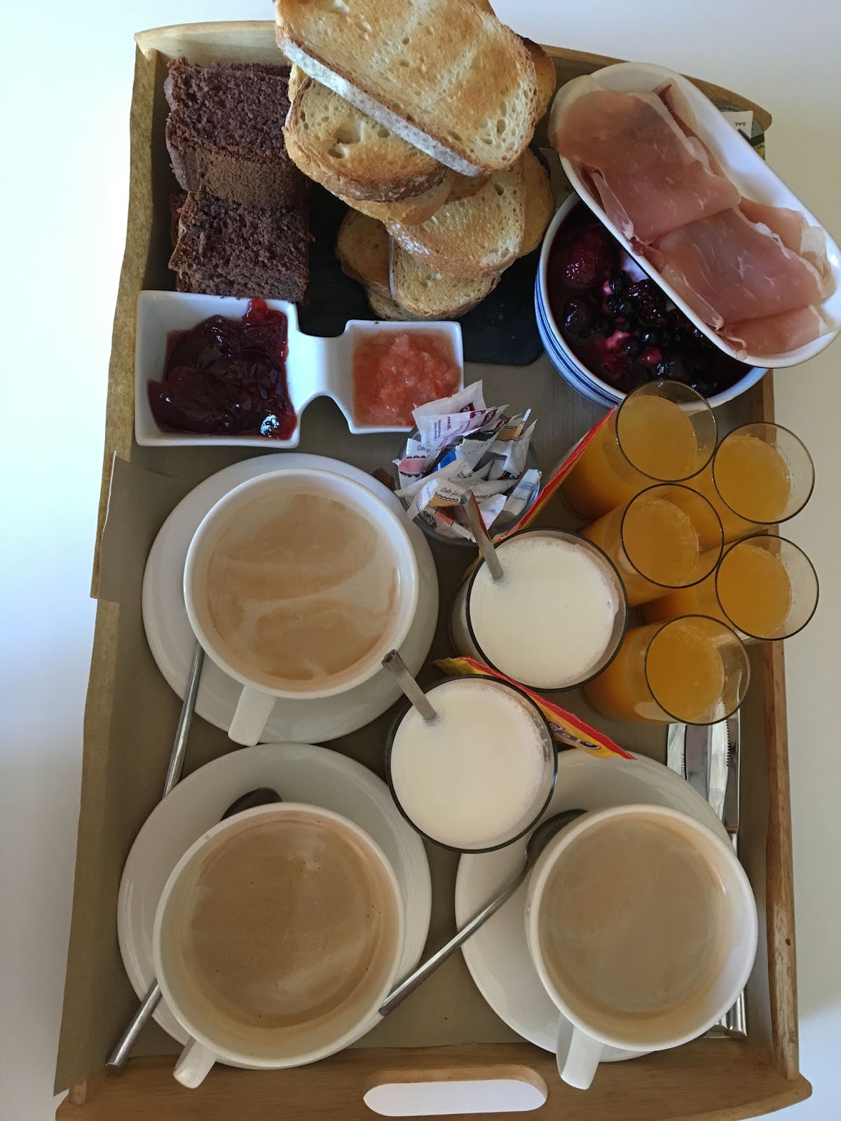 Pero puede que lo más acogedor de la hospitalidad que te dan en el hotel, es la opción de que te sirvan el desayuno en tu propia habitación. En otros hoteles, el desayuno lo tienes servido en la cafetería del mismo, con un buffet amplio en cuanto a la variedad de la elección. Pero en este concretamente, te preguntan el primer día que llegas si eres alérgico a algún alimento para no servírtelo, y si tienes una alimentación y dieta normal y variada, entonces el desayuno que te sirven es el desayuno del día y, por tanto, el mismo que te sirven junto al resto.