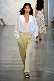 Jonathan Simkhai: sus diseños destacaron más en los «street styles». Jugó con la femenidad etérea y con la artesanía y manipulación de telas, cuyo resultado final acababa en vestidos de encaje de macramé muy largos, mmaxlip de plumas con interseccioens de encaje y túnicas. Pero también hizo buena combinación de las camisas a cuadros negros y blancos con pantalones verdes turquesas, una combinación perfecta para la primavera… o el otoño.