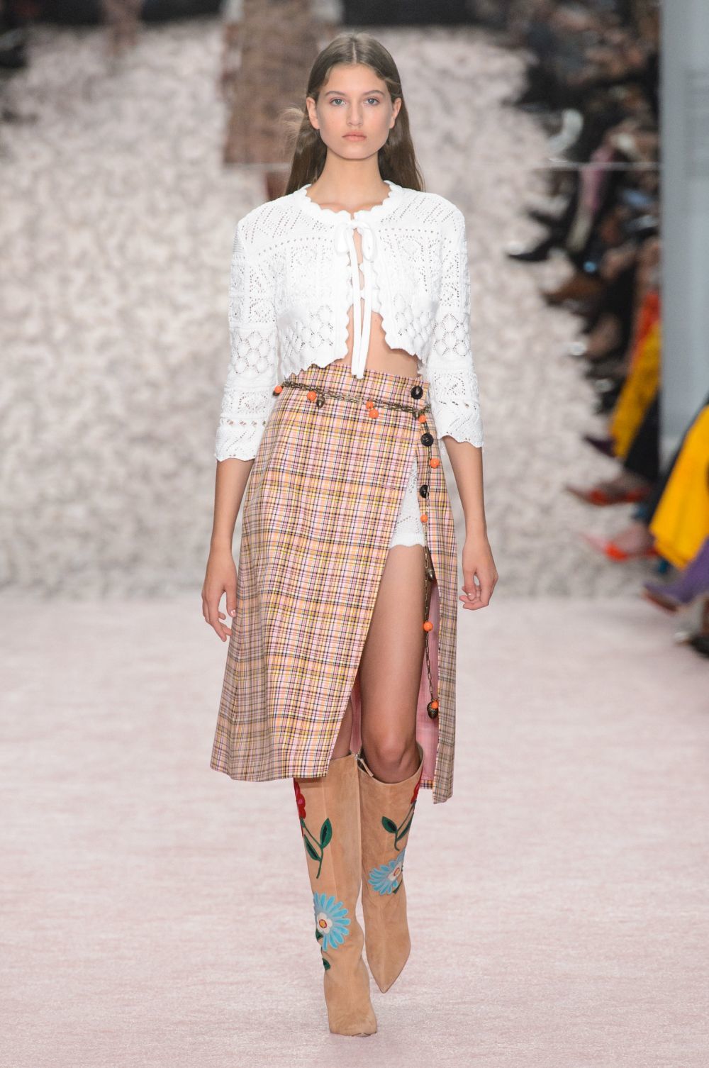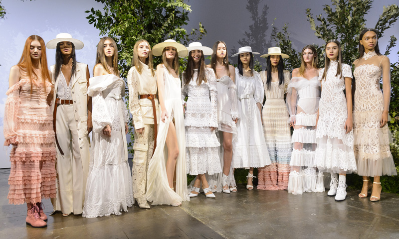 Jonathan Simkhai: sus diseños destacaron más en los «street styles». Jugó con la femenidad etérea y con la artesanía y manipulación de telas, cuyo resultado final acababa en vestidos de encaje de macramé muy largos, mmaxlip de plumas con interseccioens de encaje y túnicas. Pero también hizo buena combinación de las camisas a cuadros negros y blancos con pantalones verdes turquesas, una combinación perfecta para la primavera… o el otoño.