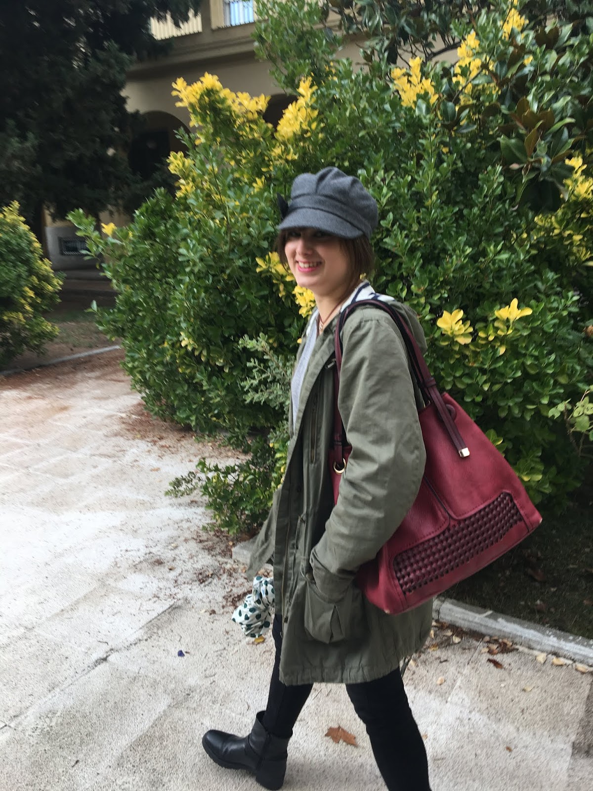 En los primeros días de lluvia, opté por combinar mi chubasquero militar, una prenda de GreenCoast que tengo desde hace dos temporadas atrás, pero como veis sigue combinando a la perfección. sustituí las botas de agua por unos botines negros estilo moteros, que daba al look un estilo rockero, pero que además, combinado con la boina, me permitía lucir un estilo sencillo y discreto para pasear bajo la lluvia.