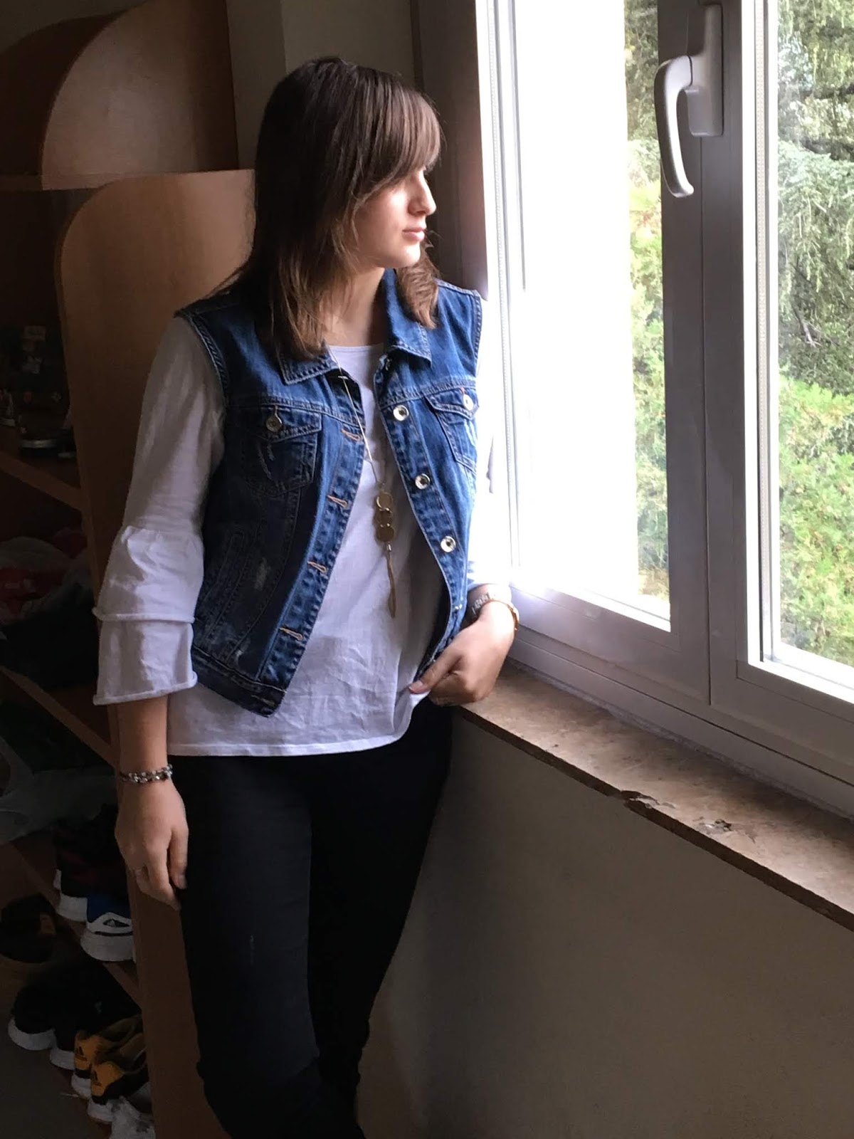 Los chalecos vaqueros están volviendo a triunfar en cuanto a complementar viejas prendas de nuestro armario para darles un tono más chick, o incluso, para darles un giro de 360º cuando es un poco sosa, monocolor o ese día no te ves muy bien con ella. Para este día, decidí combinar unos pantalones negros con una camiseta blanca con volantes en las mangas. Ésta no tiene nada en especial a excepción de su adorno, por eso ví que era la prenda perfecta para combinar con el chaleco, y para poner el punto final, me puse un collar largo para darle un toque más chick.