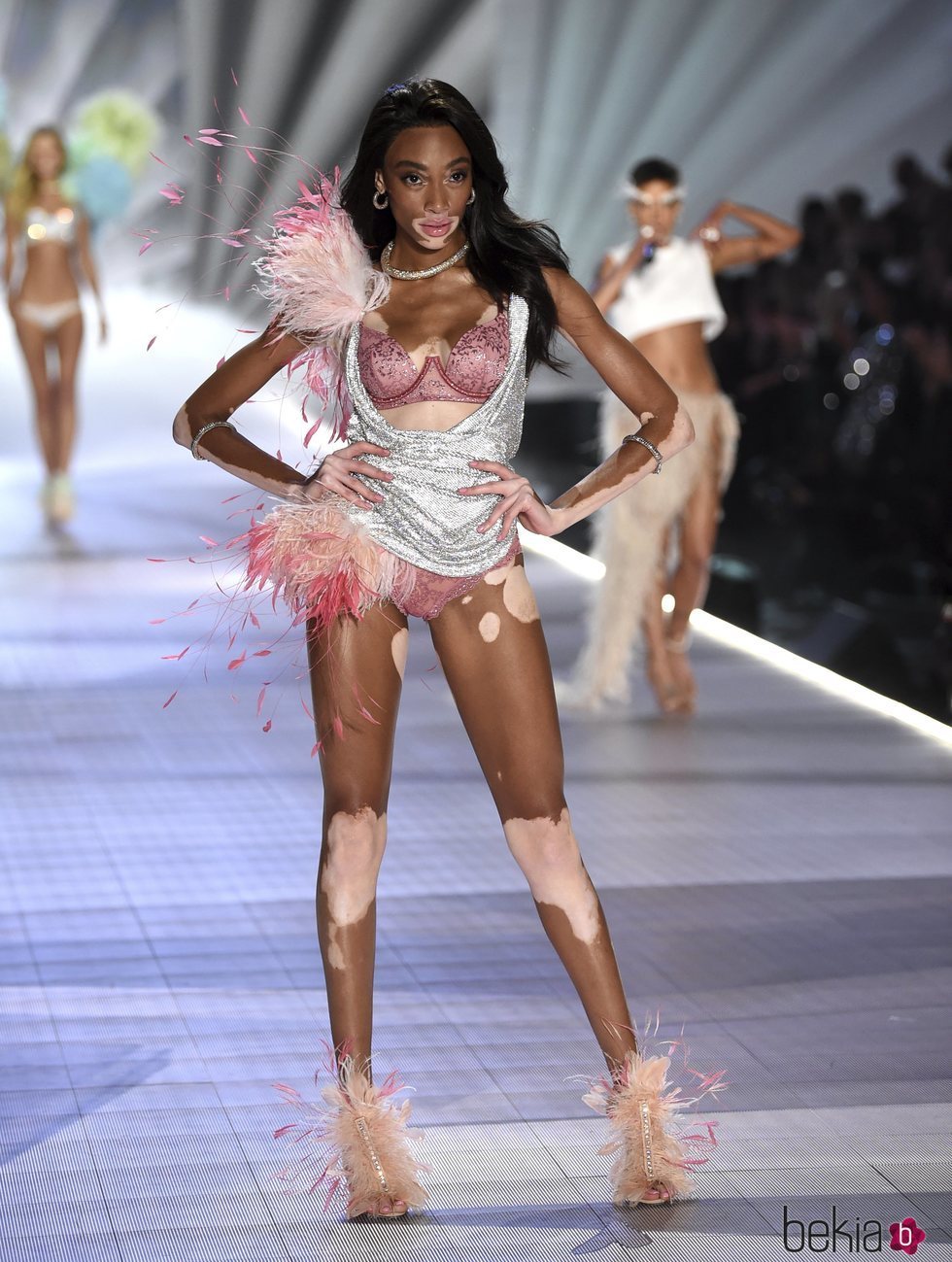 Una de las modelos estrellas y novedosas de este show, fue Winnie Harlow, que está arrasando en este último año en todas las pasarelas que cruza. Ella llevó dos trajes: el de la fotografía, un conjunto lencero con una camiseta de tirantes plateado y otro que le cubría las piernas y los brazos, muy similar al de Gigi Hadid en la imagen de arriba, pues se caracterizaba por ser un mono de estampado floral y tonos rosas y claros que daban luminosidad al traje.