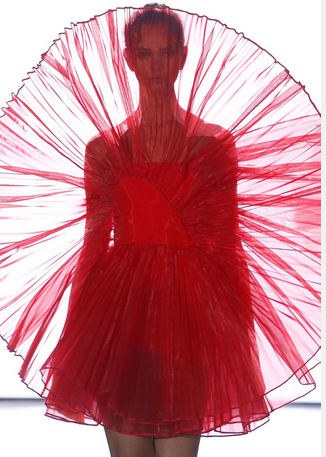 En la imagen de la derecha, vemos un vestido de color rojo con forma geométrica parecida a un velo transparente que no permite ver con exactitud el rostro de la modelo, pero sí que deja ver el estilo del vestido.