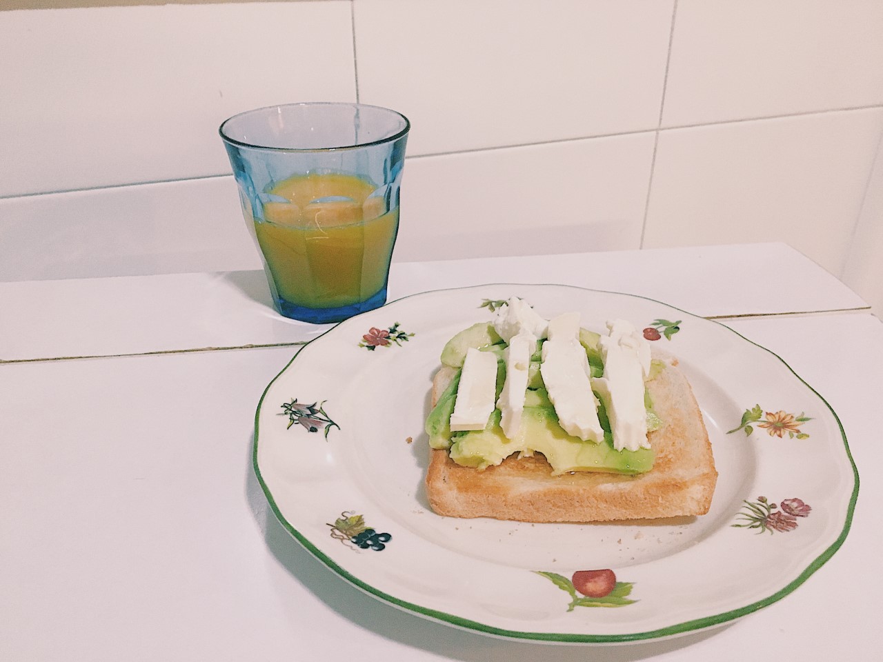 El desayuno del jueves es otro ejemplo de tostada que podéis tomar en casa. Esta vez, en vez de ser kiwi es aguacate. Es uno de los alimentos más saludables: posee grasas saludables, múltiples vitaminas como la C y la E, proteínas, magnesio y potasio. En la imagen está acompañado de queso fresco de burgos y aceite de oliva virgen extra. Es un desayuno fresco y muy fácil de ingerir. Además, podemos utilizar diversas combinaciones con el aguacate y la tostada, por ejemplo: tostada, aguacate, semillas de sésamo o de chia y aceite de oliva; o tostada, queso fresco de untar, aguacate; o tostada, aguacate, tomate, aceite de oliva virgen extra. Multitud de combinaciones en función de nuestros gustos y exquisiteces mañaneros.