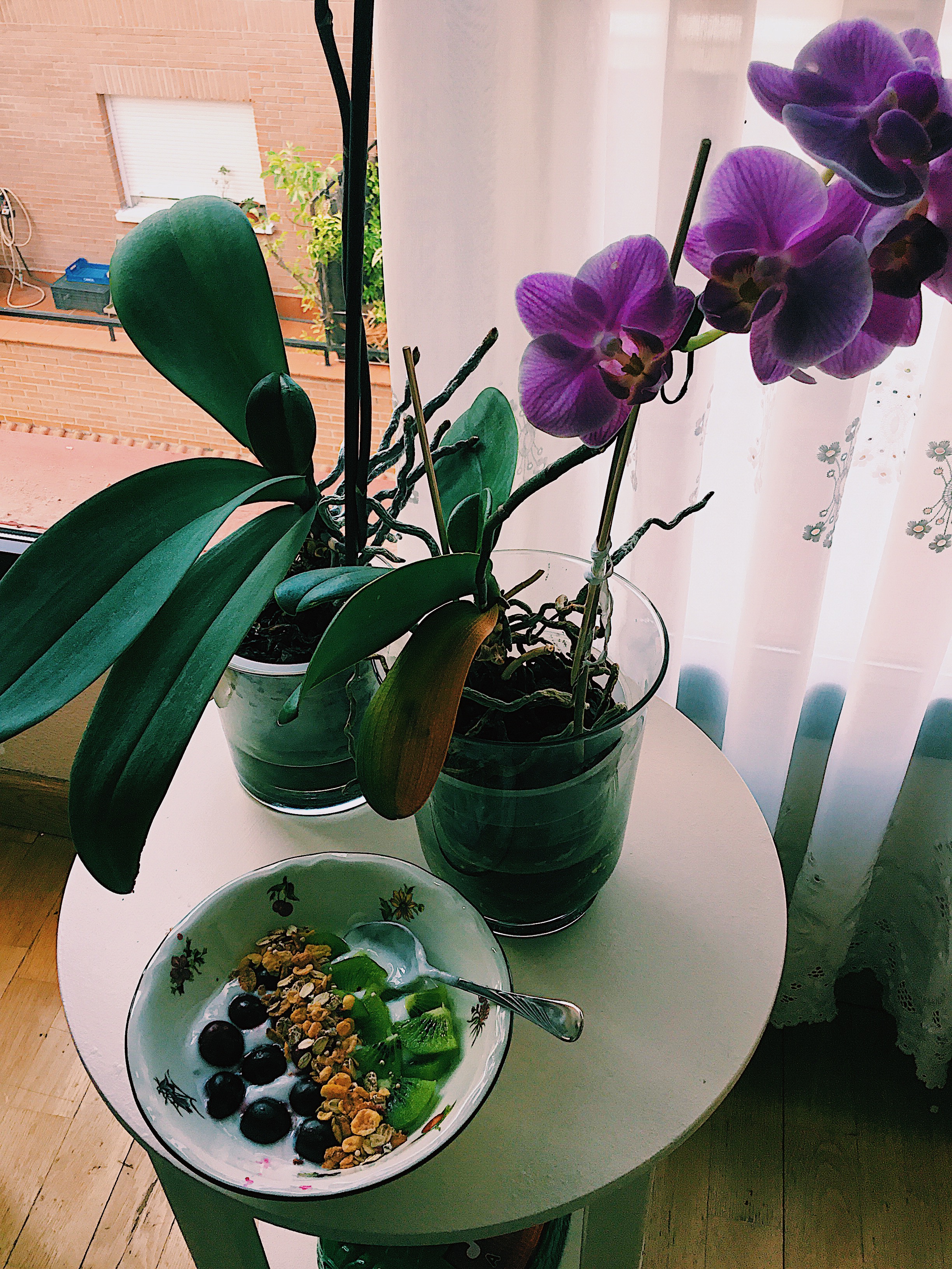 Pero, dejando de un lado el tema del azúcar, los colores que tengo en este bol son dos: rojo y verde. Este bol concretamente contiene, además de yogur, cerezas, müesli y kiwi. Las cerezas contienen vitamina A que permite una depuración de mi organismo para facilitar la digestión y también tiene vitamina C y mucha fibra. Por otro lado, también tenemos el kiwi, una fruta considerada cítrica, tiene un alto contenido en fibra, antioxidante, vitaminas como la C y la E y también potasio.