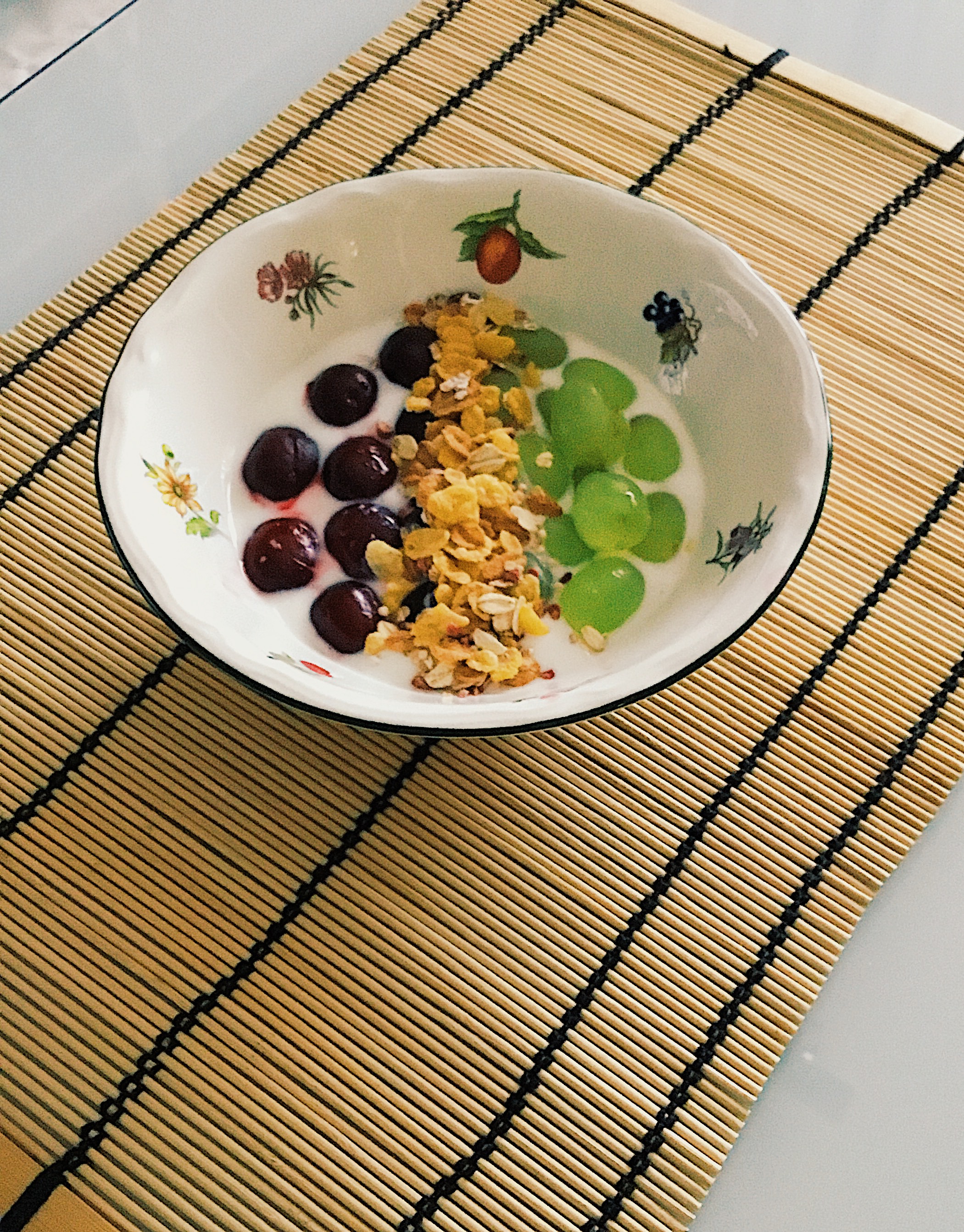 El bol del martes fue muy similar al del lunes, aunque sólo sea por las cerezas. Pero en este caso, el tono verde pasa de ser del kiwi al ser de uvas. Las uvas son perfectas para acompañar a este tipo de yogures cero azúcares, porque permite darle el toque dulzón que muchas veces echamos de menos. Las uvas en particular, es una de las piezas de fruta que recomienda la OMS ingerir todos los días. Contienen una gran variedad de nutrientes, cvitaminas y minerales. Además, contienen más de un 80% de agua que ayuda a aligerar el organismo, y su calcio (15 mg/100 g) y otros elementos alcalinos estimulan el hígado (órgano que equilibra la acidez de la sangre y la limpia).
