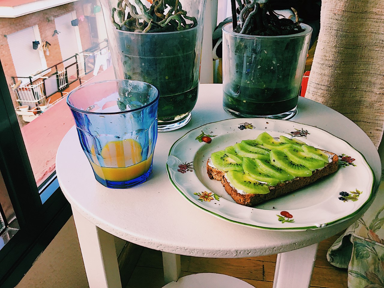 La tostada es una fuente de carbohidratos y la mejor elección para un desayuno rico y para que nos dé fuerzas para todo el día. Es uno de los mejores ingredientes para un menú saludable dentro de nuestra dieta diaria. Además, puede combinarse de multitud de maneras para nunca aburrirnos en los desayunos. En la foto la tostada es de pan de semillas, con queso de untar y kiwi. Esta fruta tiene muchas vitaminas que fortalecen el cuerpo de manera natural, tanto por dentro como por fuera. Por ejemplo, ayuda a la digestión y permite la no retención de líquidos, además, sirve de filtro para los rayos solares en la piel facial especialmente para aquellas personas que son extremadamente sensibles a los rayos UVA. Además, el zumo de naranja es sólo un complemento de la fruta del plato, nos proporciona vitamina C para todo el día.