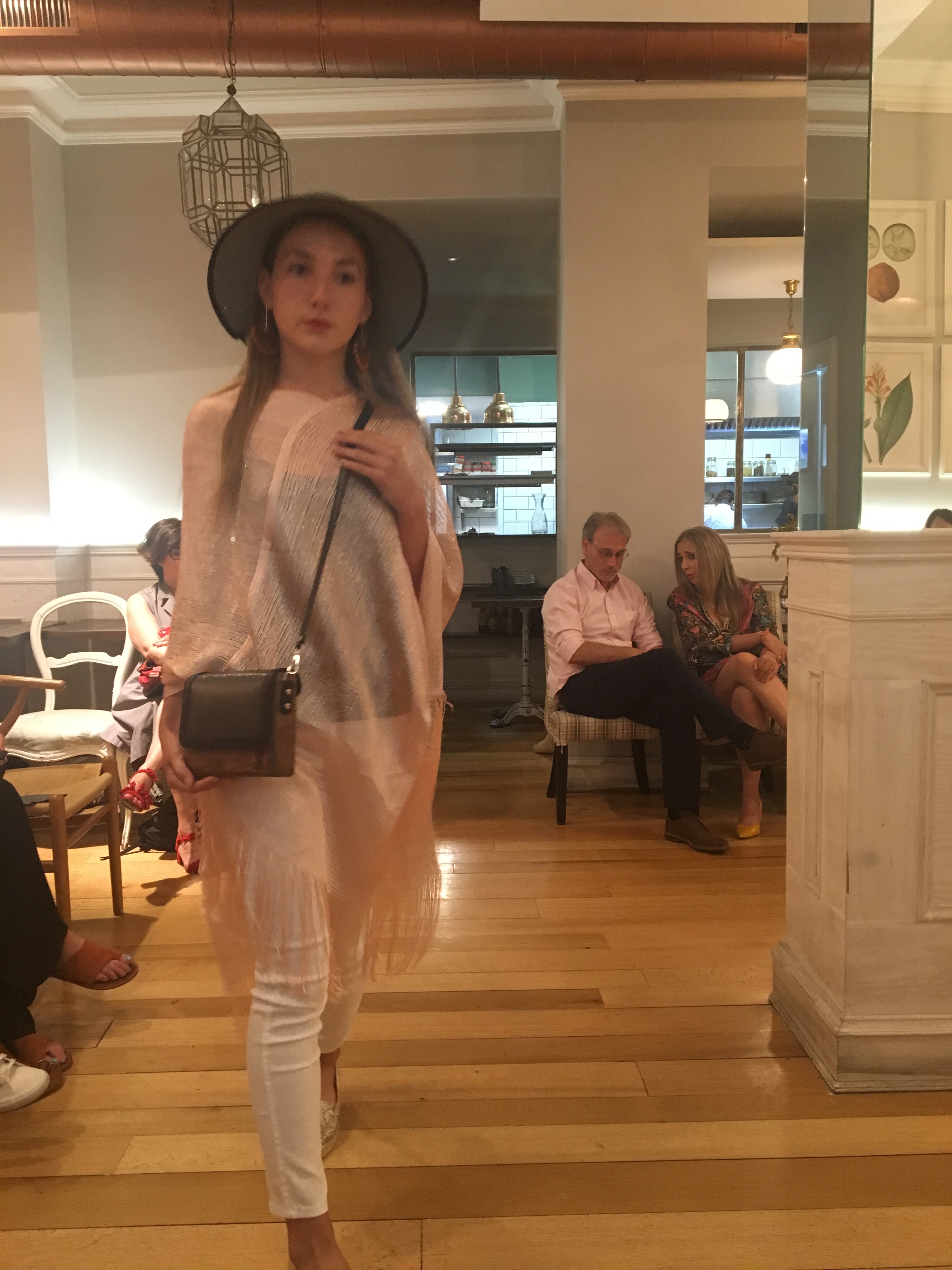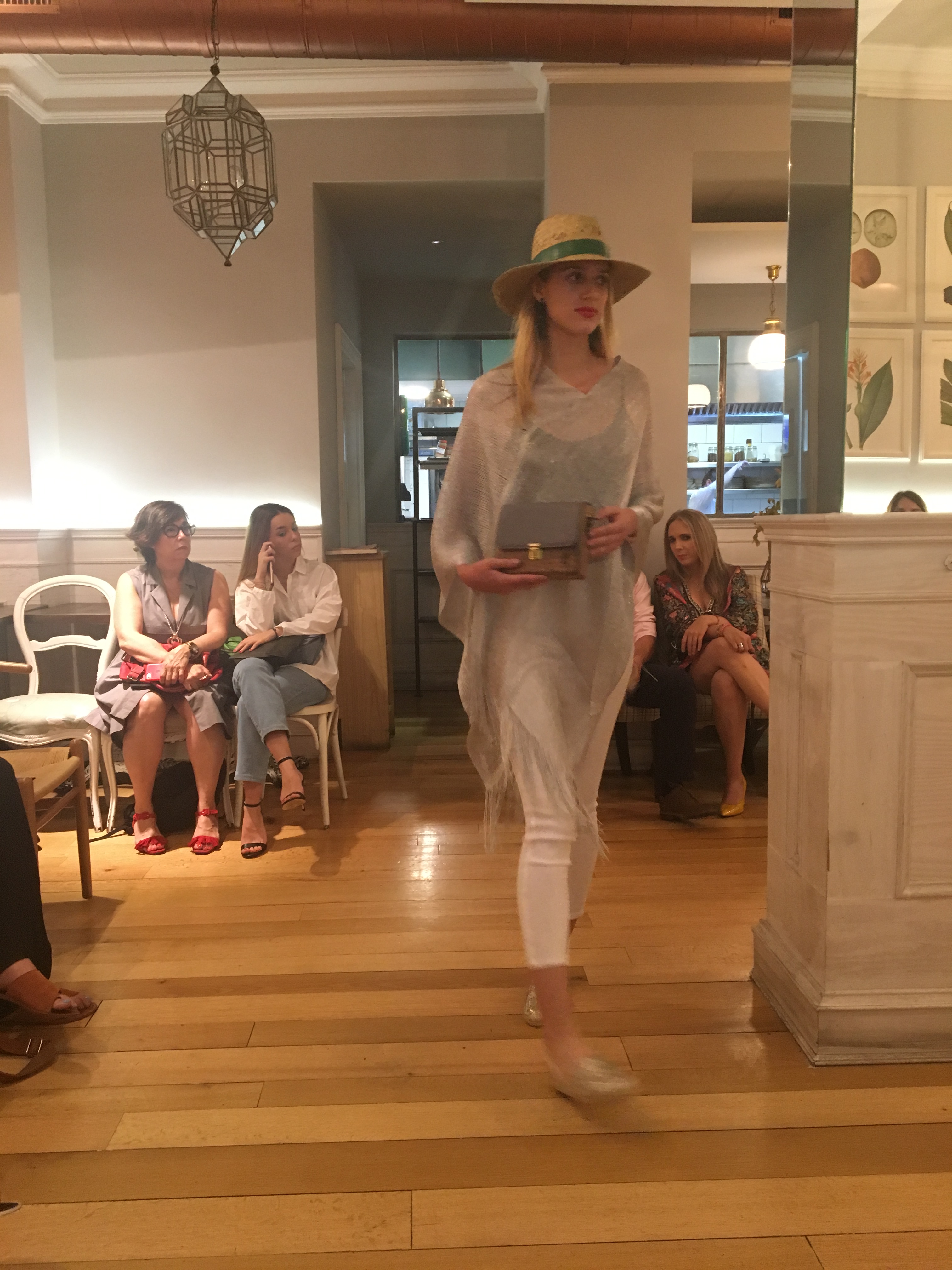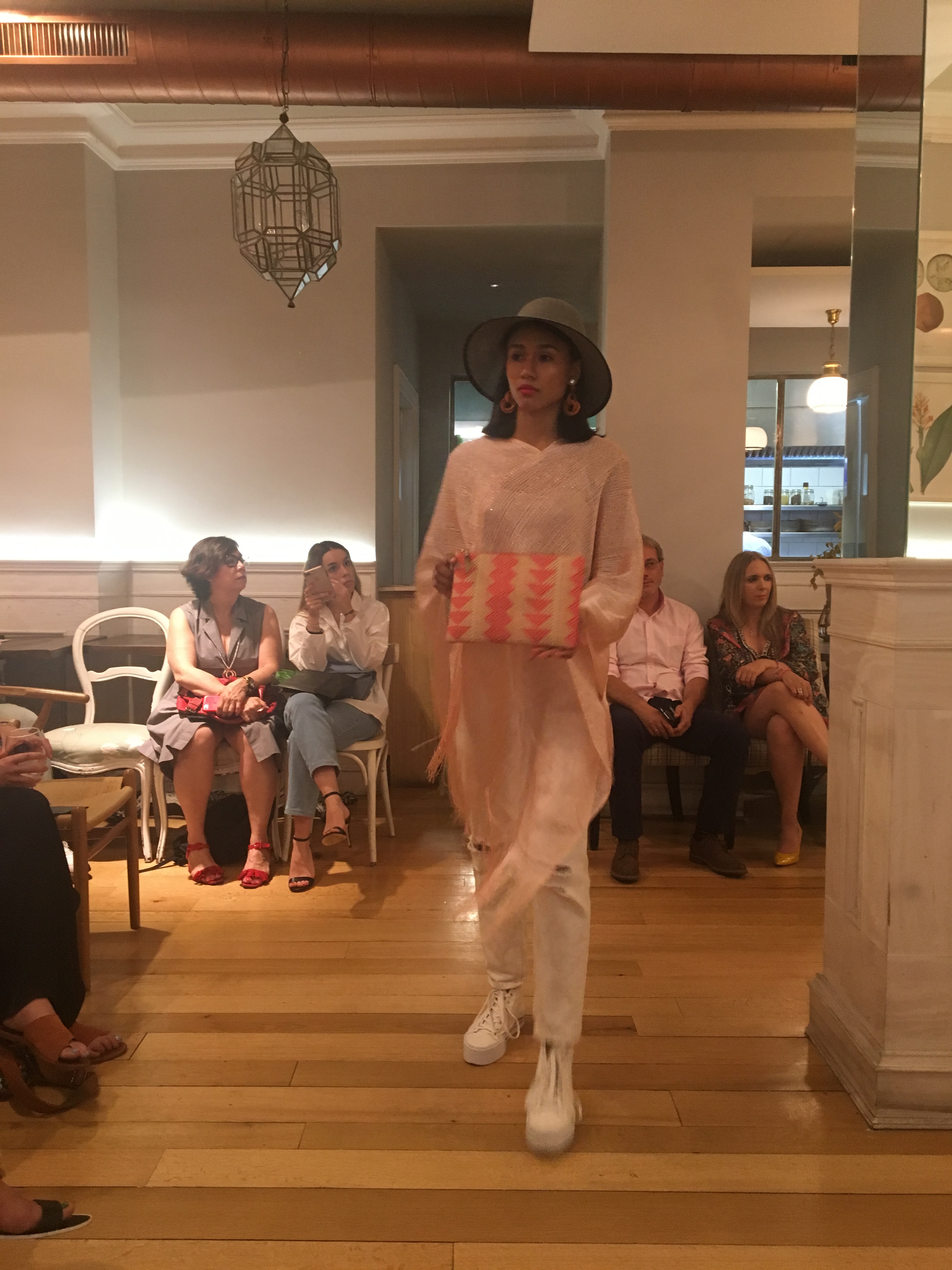 El miércoles tuve la oportunidad de comenzar este despliegue de fashion, en un lugar pequeño, cuqui y mono a la vez. En la calle de Recoleto, se encuentra el restaurante La Jefa, un lugar que ahora mismo acoge un menú de moda Gastro inspirado en la firma Lauwood, la cual desplegué sus bolsos sostenibles por los pasillos de madera y dejó danzar a las modelos a través de los lagos recorridos de paredes de donde colgaban luminosas lámparas y grandes cuadros y esculturas.