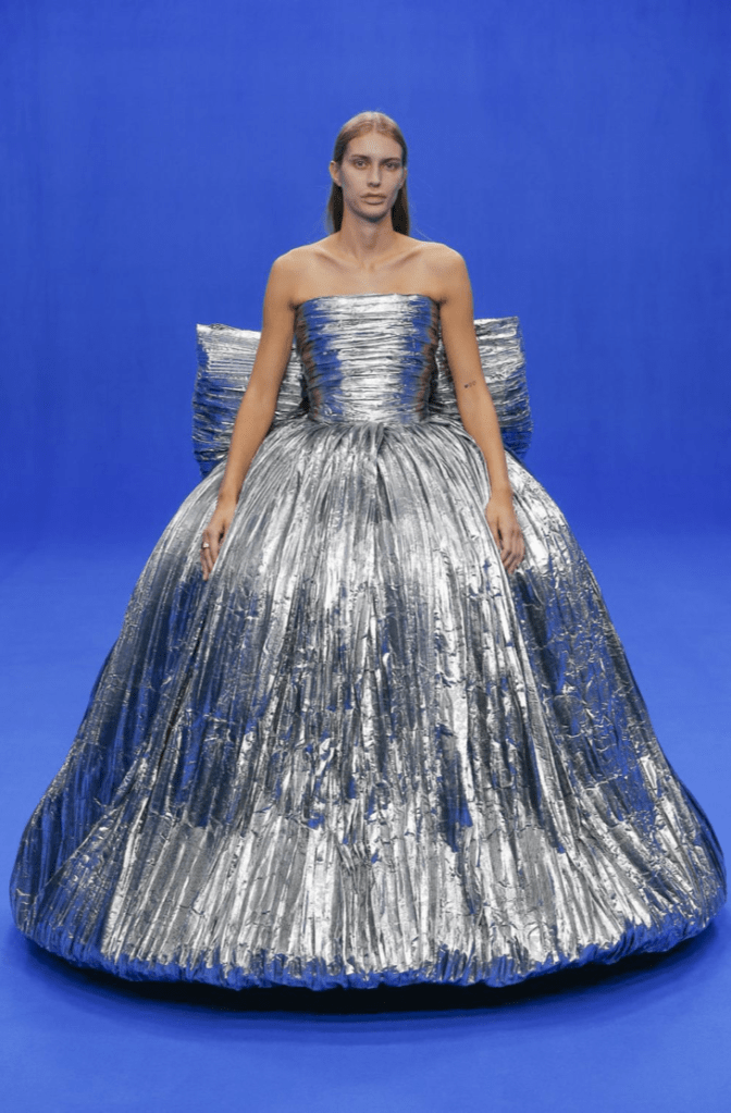 El diseñador Demna Gvasalia se ha inspirado en la uniformidad de los políticos en las grandes cumbres mundiales e internacionales que vemos en la televisión. Además, ha querido adaptar todos esos trajes y prendas de lujo a todo tipo de cuerpos y gustos. Así, como resultado pudimos apreciar una combinación de vestidos ajustados y cortos en terciopelo neón, pero también una representación y oda al diseñador al puro estilo español, con grandes y pomposos vestidos únicos.