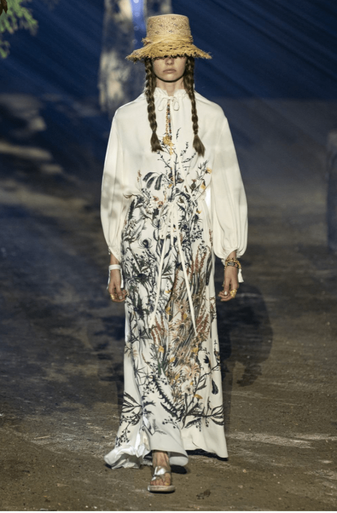 El desfile de la gran firma francesa se ha centrado en la sostenibilidad, reflejada en la colaboración con COLOCO, un colectivo de botánicos, jardineros y paisajistas que han ayudado a la diseñadora Maria Grazia a crear una colección exquisita. LAs prendas presentadas estaban impresas, bordadas, con cristales y filigranas, donde el encaje, la rabia, el jacquard, la seda y el tul se colocaban en capas y se entrelazaban. Todo esto dando como resultado una combinación de chaquetas cuadradas, románticos vestidos con mangas largas semitranparentes, pantalones anchos, shorts sueltos y faldas largas llenas de volumen.