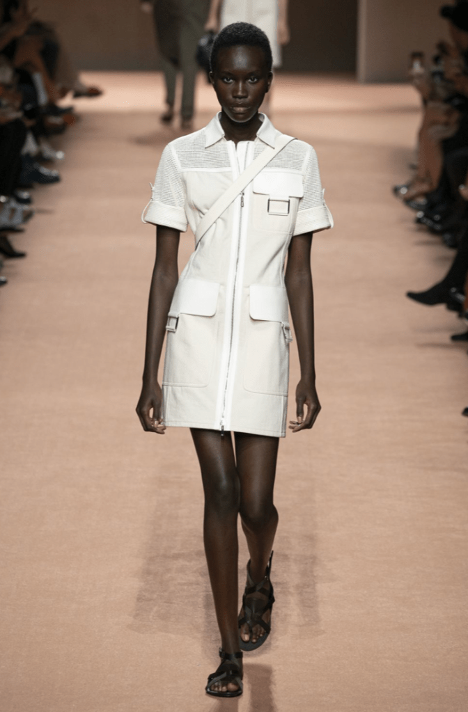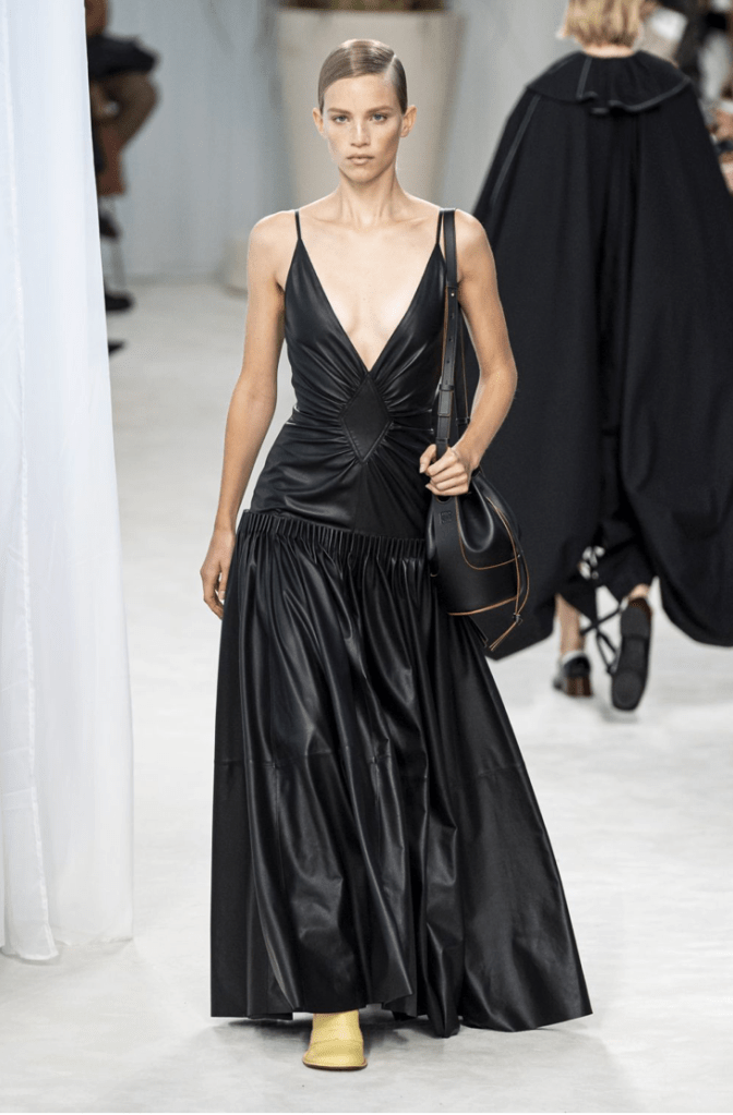 Si el resto de firmas se han preocupado por crear colecciones asimétricas, la marca famosa por el cuero, optó por prendas rectas, simétricas y minimalismos propios de los años 90. Su tejido estrella, el cuero, tuvo muchísimas variaciones y combinaciones, como el ante. Incluso cuero con organdí, que creaba con pantalones cargo semi-transparentes o tops tipo túnica.
