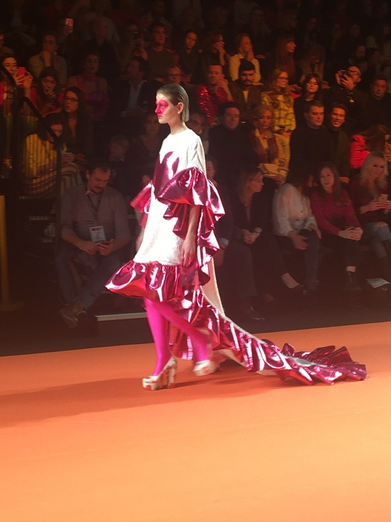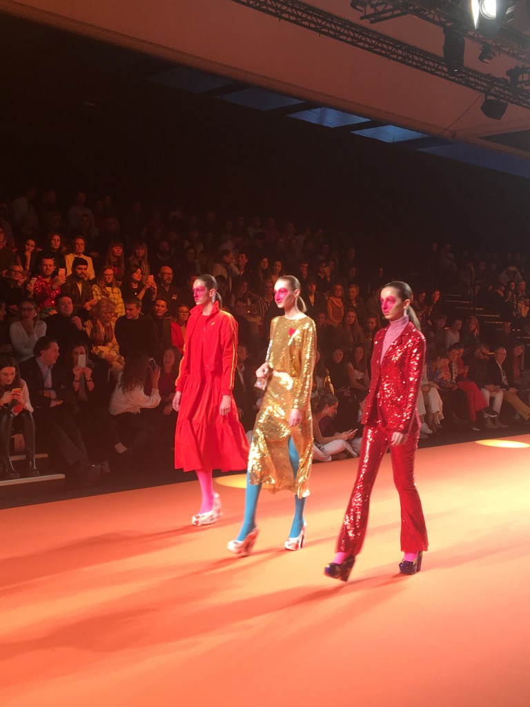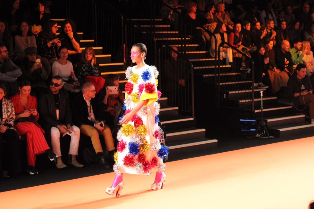 Mientras los asistentes iban sentándose en los asientos, la alfombra naranja cubierta por un plástico llamaba la atención. No dudaba nadie de que iba a ser «la bomba». Sobre todo, por cómo empezó. El desfile se lo dedicó a su mano derecha que recientemente había fallecido y pidiendo un minuto de silencio por ella. El minuto acabó con el comienzo de una música estridente de discoteca, que daba ganas de levantarse para ponerse a bailar. Salió la primera modelo con grandes tacones, altos y mucha plataforma, de color azul marino con estrellas. Es en ese momento cuando piensas, esto será increíble.