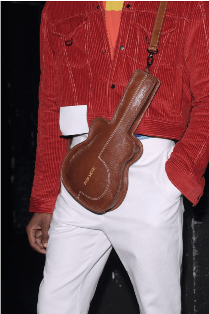 Aquí vemos un ejemplo de sus diseños. Colores vivos, pero coqueros: tela pana, color fuerte como el rojo, y bolso en forma de guitarra de cuero marrón.
